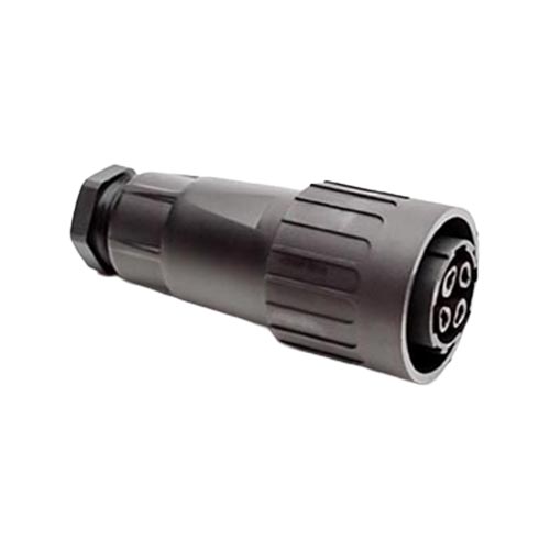 3+PE Female cable connector with internal strain relief and clamping ring. For use with crimp contacts (sold separately).