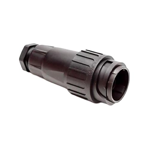 3+PE Male cable connector with strain relief and clamping ring. For use with crimp contacts (sold separately).