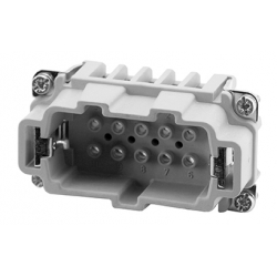 10 + PE Heavy duty male contact insert for turned crimp contacts. May be engaged or disengaged when live but without electrical load. If this connector is mated or unmated under load, the load shall be reduced to 10% of the rated current